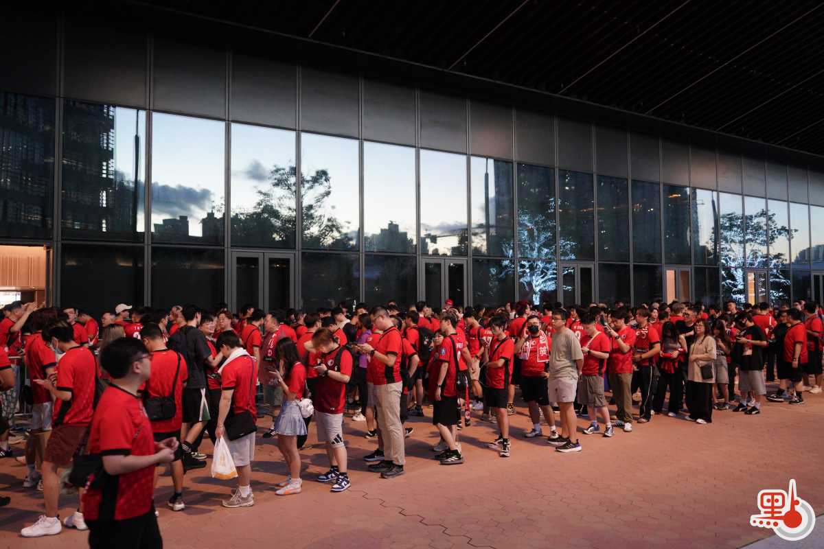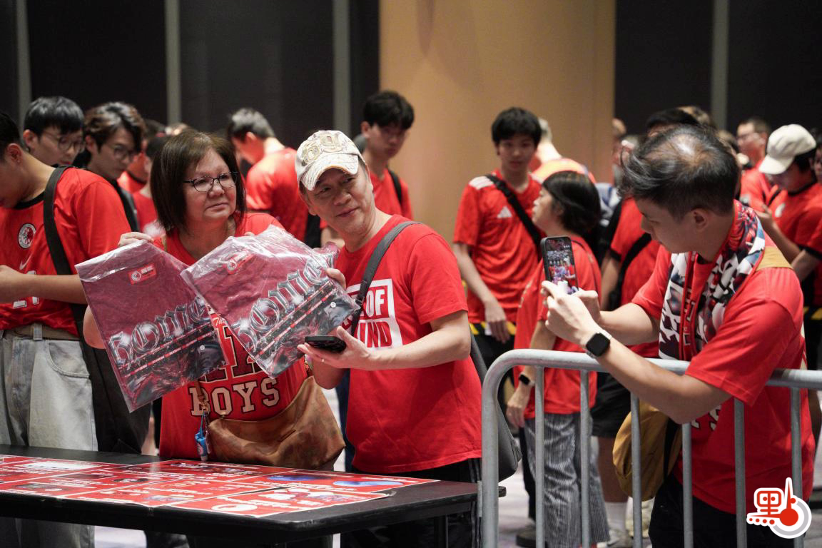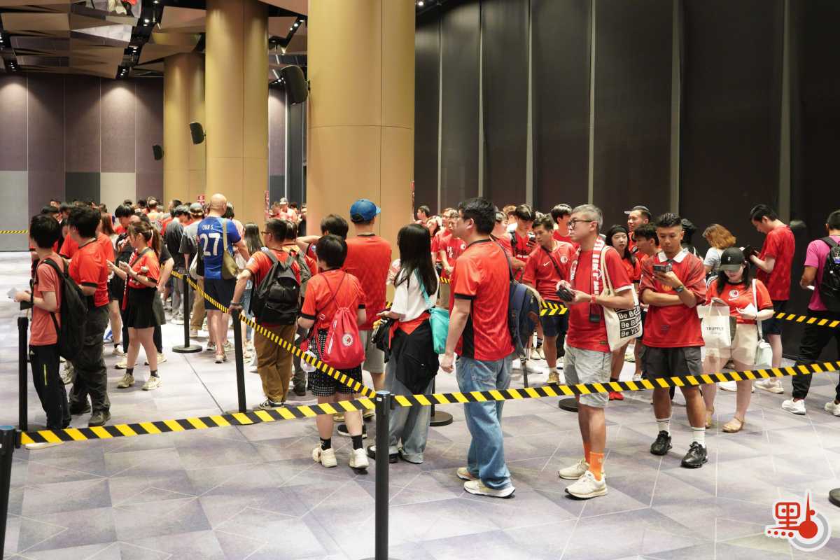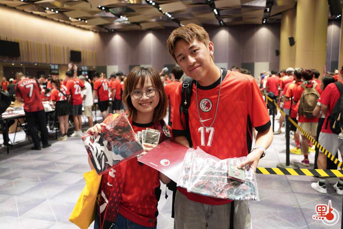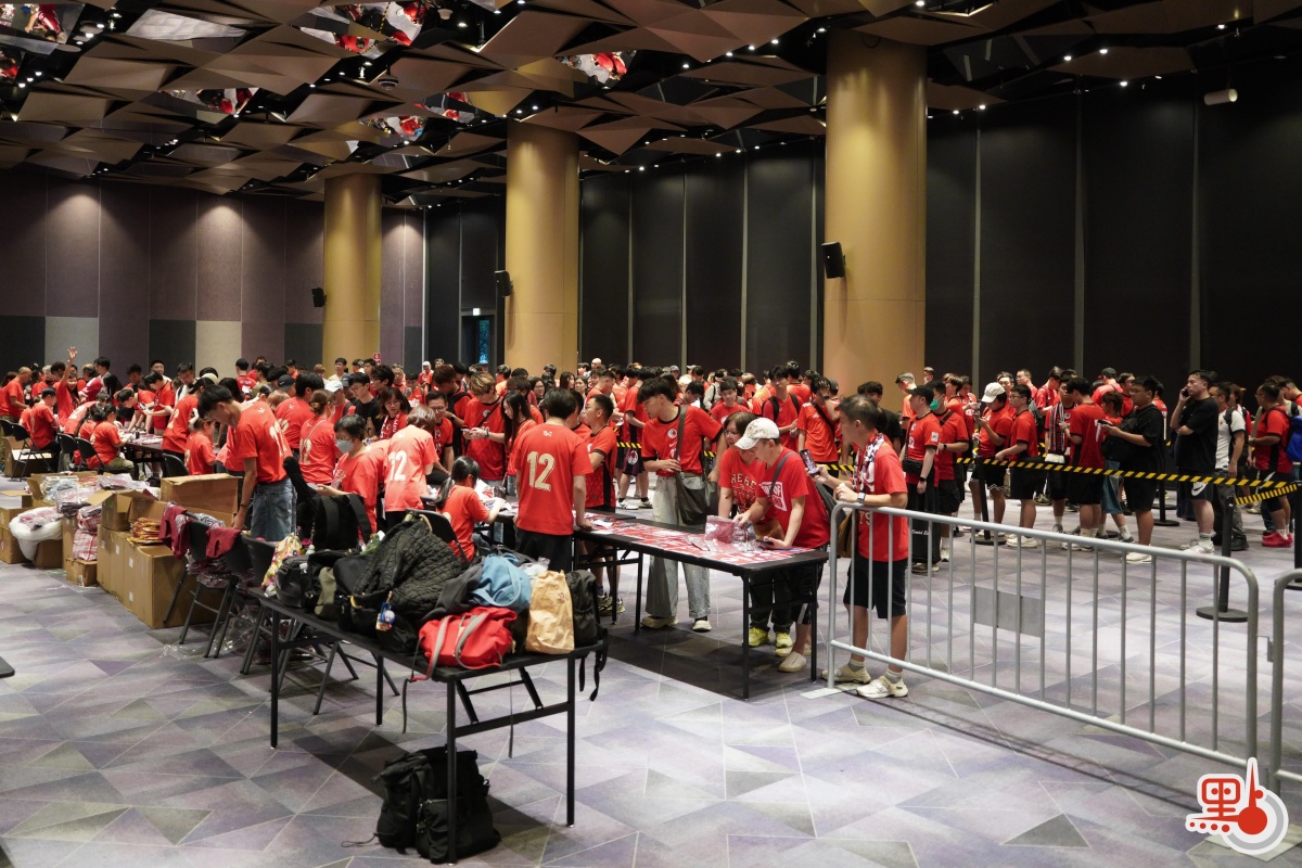 點新聞記者今日下午約5時半抵達啟德主場館,現場早已人頭湧動,眾多球迷身穿紅色港隊球衣提早到達場館,耐心等待入場。球隊的官方商品銷售點更是大排長龍,隊伍從室內延伸到室外,儘管傍晚的天氣仍較炎熱,球迷的熱情也毫不消減。