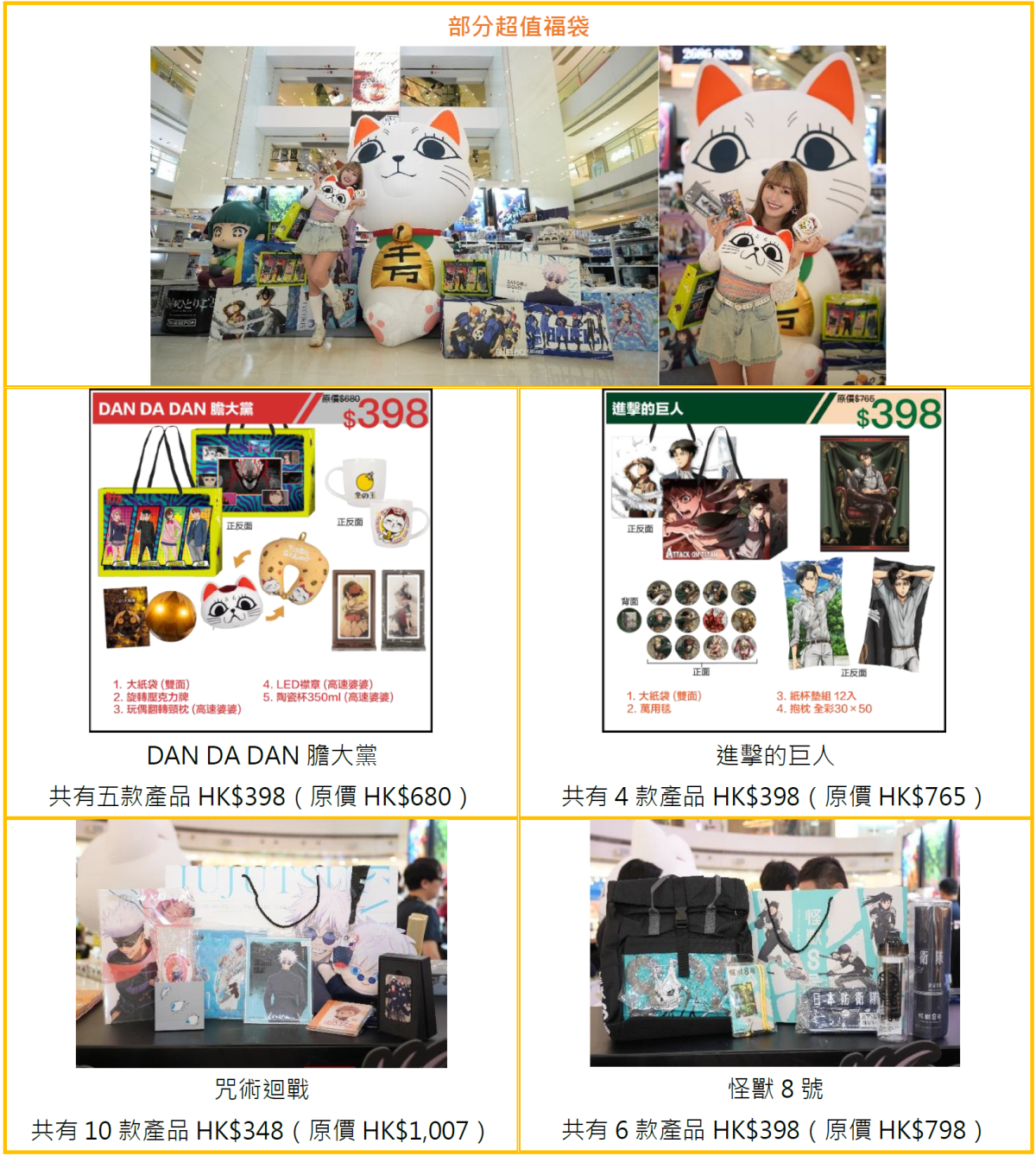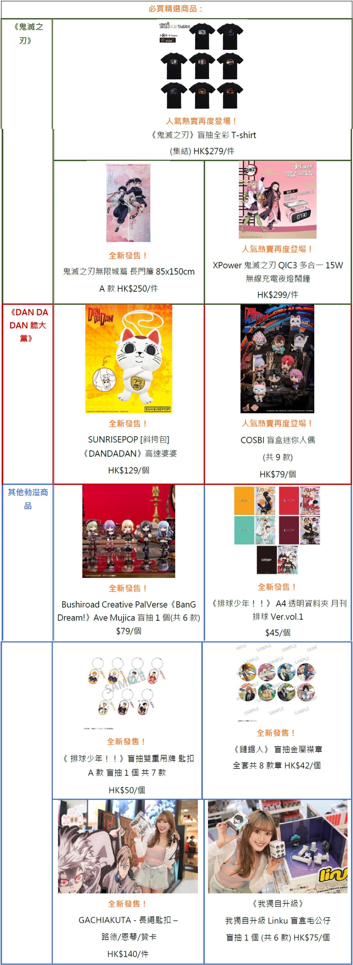 產品方面,今年「動漫聯動祭」合共過千款產品,部分更是全新發售,亦有於動漫節火速售罄的精品重新登場,重點推介:《鬼滅之刃》劇場版無限城篇盲Tee裇、《我獨自升級》LINKU 盲盒毛公仔、全港首賣SUNRISEPOP《藥師少女的獨語》收藏卡、Hot Toys《DAN DA DAN 膽大黨》COSBI盲盒人偶、《BanG Dream!》Ave Mujica盲抽公仔、以及9款低至29折超值福袋等等。