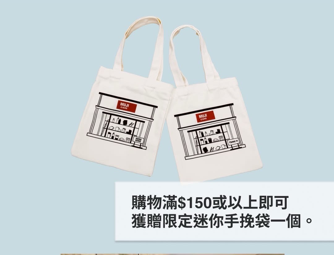 即日起至11月2日,顧客凡於MUJI com港鐵香港站或港鐵青衣站消費淨值滿$150或以上,即可獲贈限定迷你手挽袋一個。禮品每日數量有限,送完即止。即日起至26日,MUJI app會員於MUJI com港鐵香港站或港鐵青衣站作任何消費,可享雙倍積分獎賞。