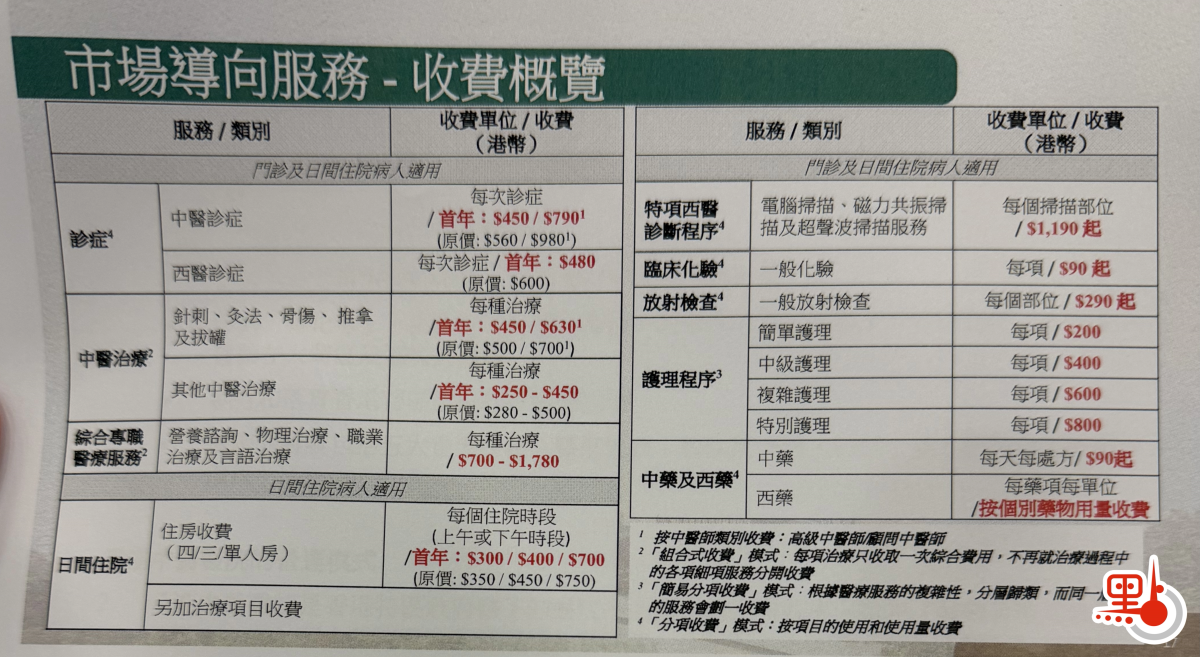 開院首年,醫院部分指定服務有7至9折優惠。其中,資助服務門診收費港幣$180起;日間住院每個住院時段港幣$450起(原價$620);特項西醫診斷程序收費港幣$500起,含電腦掃描、超聲波掃描等。市場導向服務門診收費港幣$450起;特項西醫診斷程序收費港幣$1190起。
