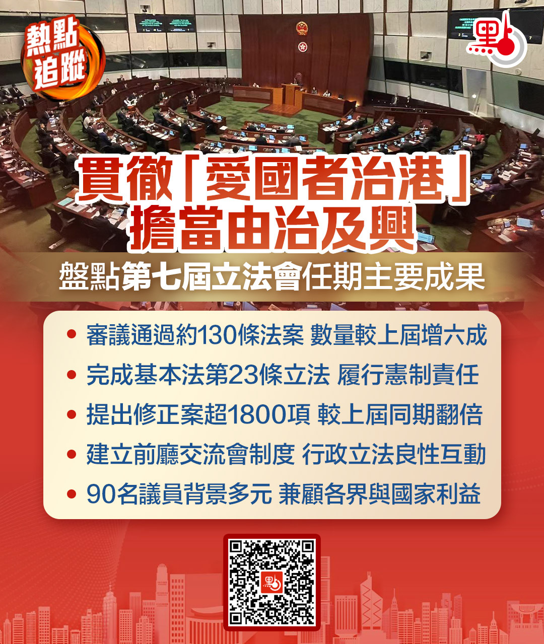 【點新聞報道】第七屆立法會的任期由2022年1月1日開始,直至2025年10月24日終止。本屆立法會全面落實「愛國者治港」原則,展現出務實高效的新氣象。任期內,立法會堅定履行憲制責任,成功完成基本法第23條本地立法;同時高效審議通過約130項法案,並批准近7000億港元撥款,以推動土地房屋、基建等關鍵項目,在維護國家安全、促進經濟民生發展方面取得了標誌性成果。
