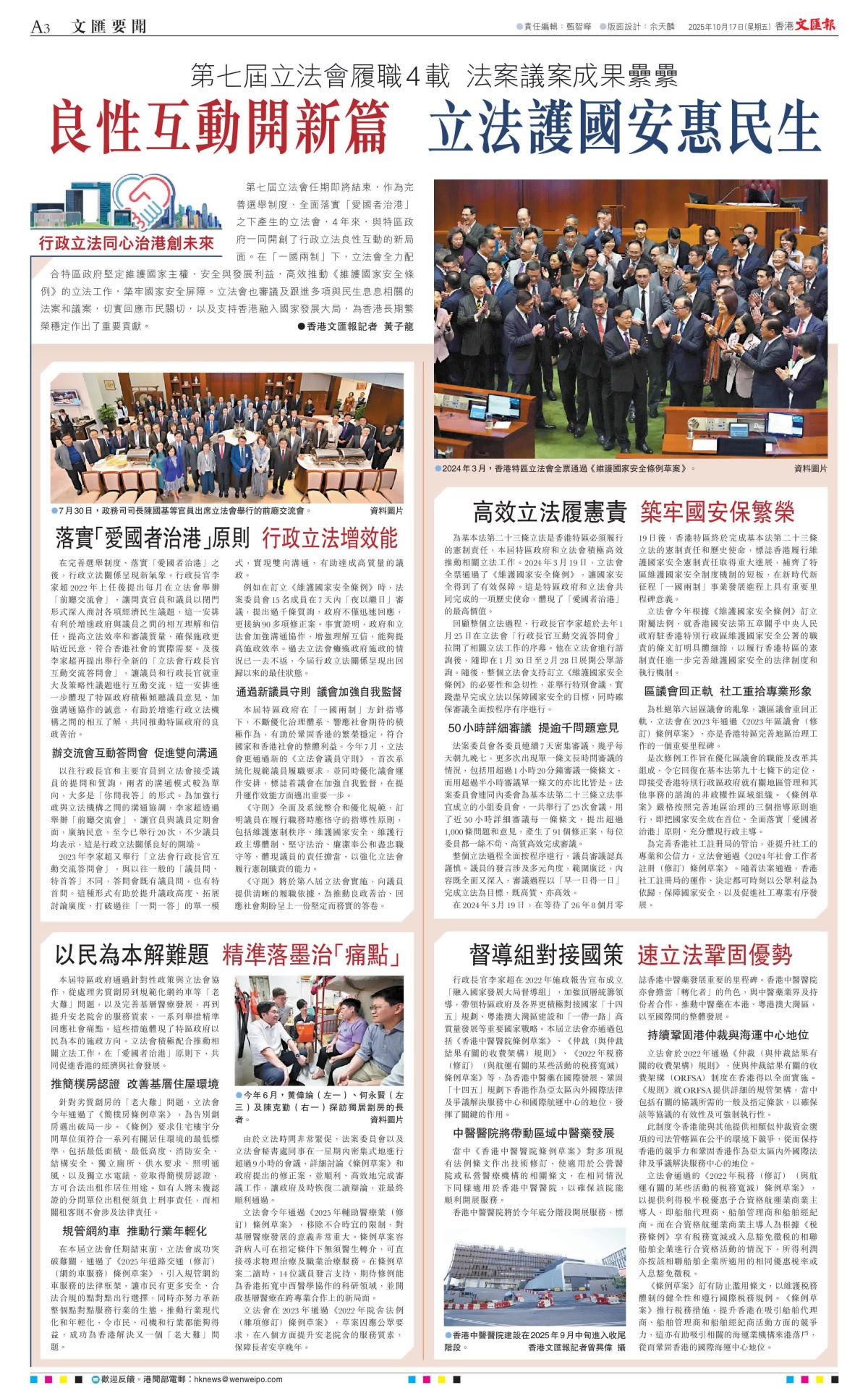 例如在訂立《維護國家安全條例》時,法案委員會15名成員在7天內「夜以繼日」審議,提出過千條質詢,政府不僅迅速回應,更接納90多項修正案。事實證明,政府和立法會加強溝通協作,增強理解互信,能夠提高施政效率。過去立法會癱瘓政府施政的情況已一去不返,今屆行政立法關係呈現出回歸以來的最佳狀態。