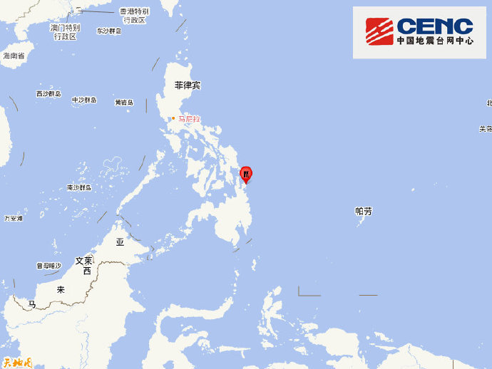 中國地震台網亦測定,今日上午7時03分,在菲律賓棉蘭老島附近(北緯9.68度,東經126.17度)發生6.1級左右地震。