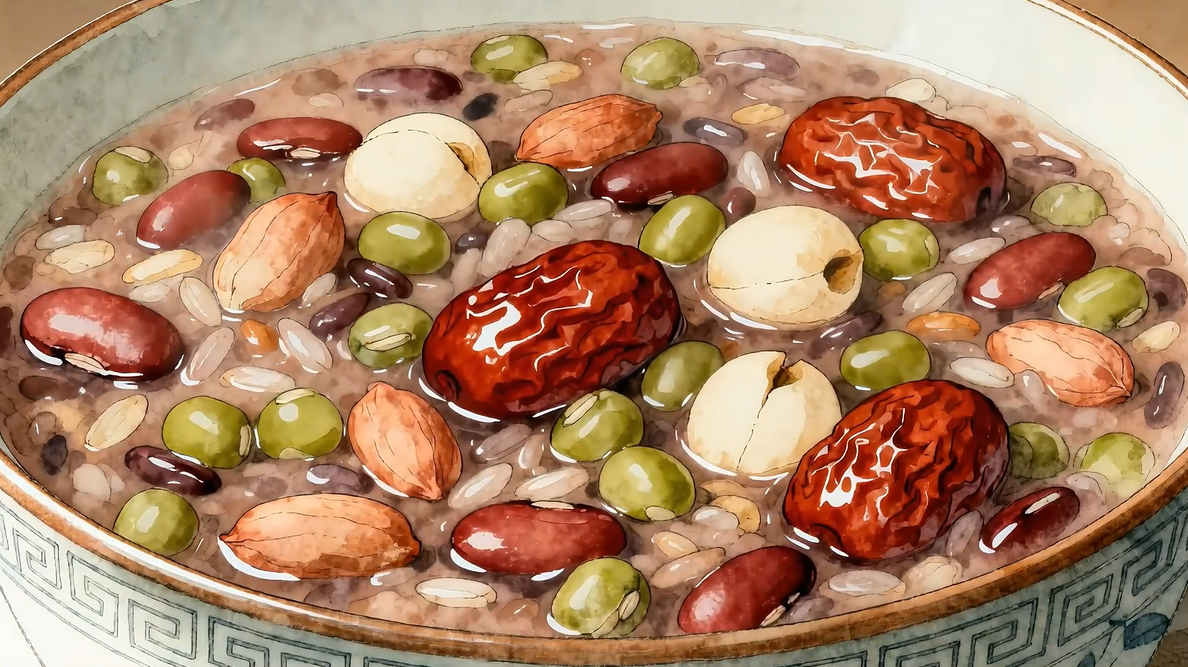 Laba porridge features eight ingredients such as red beans, green beans, lotus seeds, and peanuts. As the aroma of porridge fills the chilly winter air, this warmth, carried through millennia, is now brought to life with AI animation.