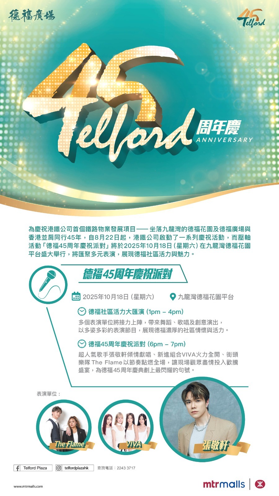 而壓軸活動「德福45周年慶祝派對」將於10月18日(星期六)在九龍灣德福花園平台舉行。「德福45周年慶祝派對」將匯聚多元表演,展現德福社區活力與魅力。活動更特邀重量級歌手擔任表演嘉賓,與實力流行樂手傾力演出,以熾熱音樂燃點全場!