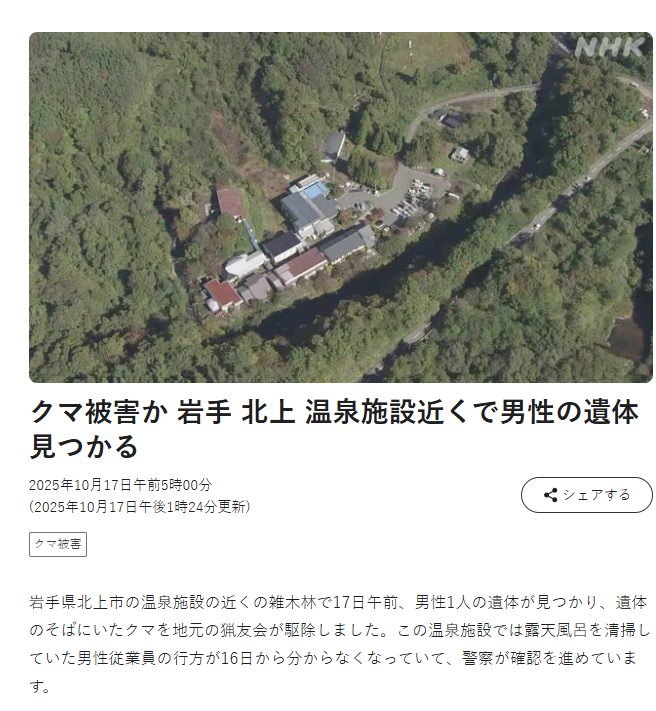 【點新聞報道】據日媒報道,日本岩手縣北上市一間溫泉旅館附近的叢林,今日(17日)上午發現一具男性遺體,旁邊有一隻已被捕殺、體長約1.5米的熊。警方正在調查死者是否為昨日(16日)在旅館露天浴池打掃後失蹤的男員工。