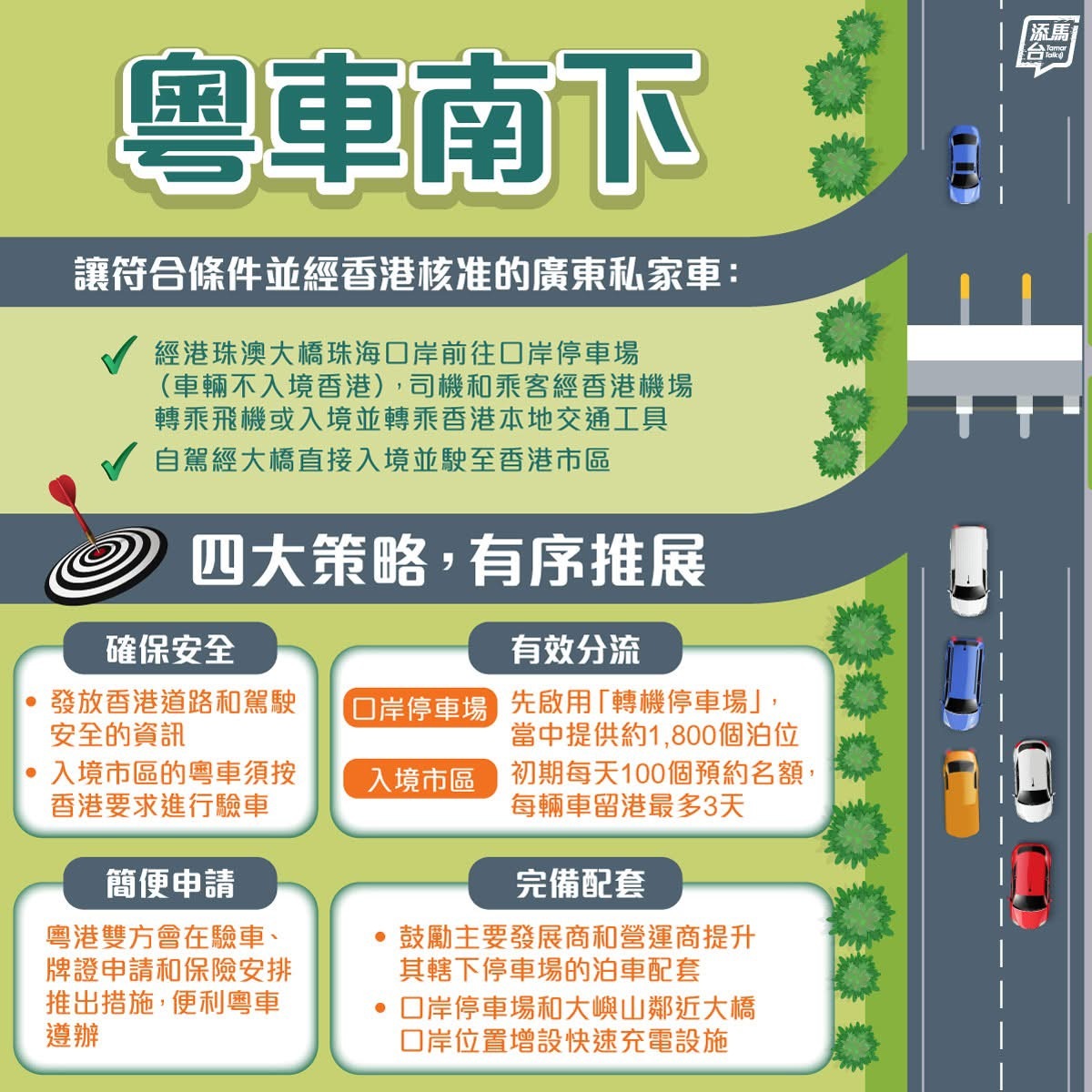 A:獲批南下粵車只可經港珠澳大橋抵港,可申請口岸停車或入境市區。
