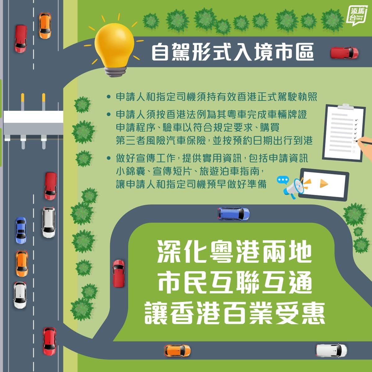 自駕入境市區模式:為保障交通安全,入境香港巿區的申請人和指定司機,均須持有香港正式駕駛執照;申請人須完成車輛牌證、驗車及購買進入香港期間的第三者保險;每次赴港前需要預約出行,並依照預約日期出行到港。
