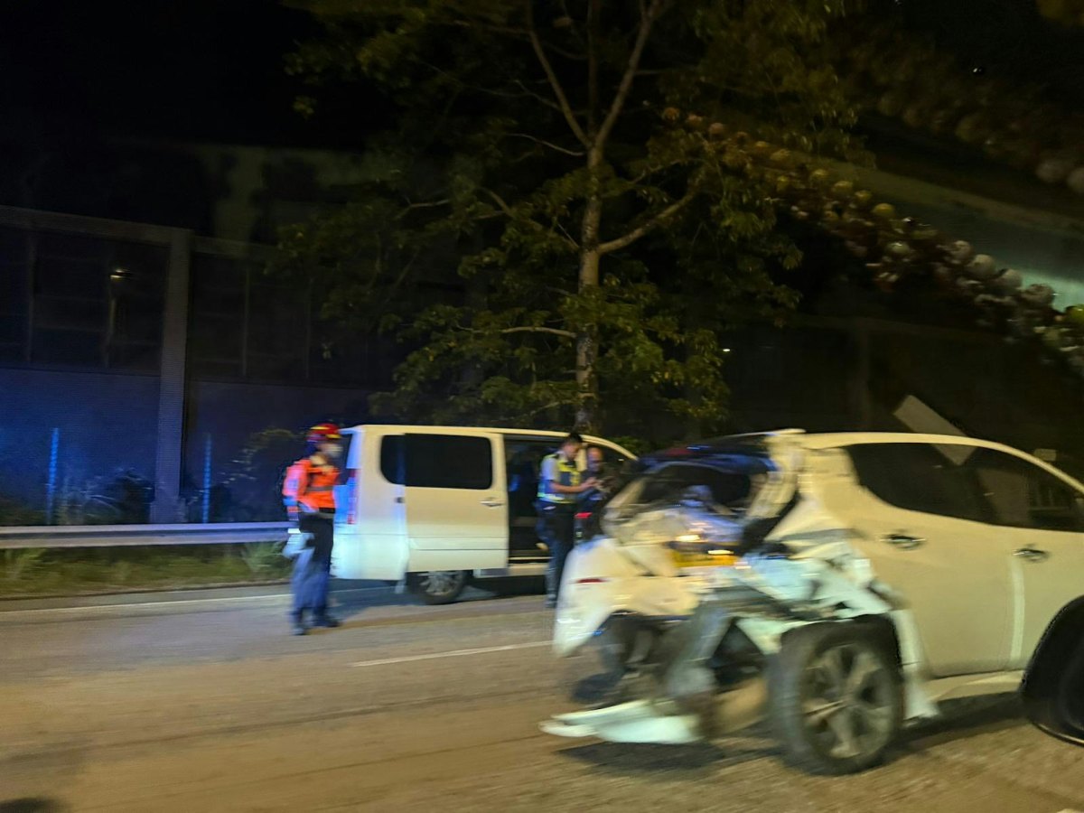 現場圖片可見,私家車車位被嚴重撞毀,深深凹陷,涉事貨車則停在欄杆邊,有警員趕抵現場協助調查意外成因。