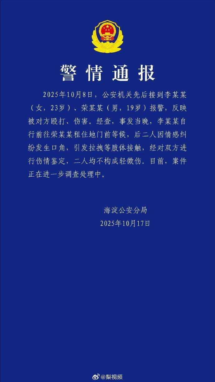 10月17日晚間,海淀公安分局通報榮梓杉李禹熹糾紛:2025年10月8日,公安機關先後接到李某某(女,23歲)、榮某某(男,19歲)報警,反映被對方毆打、傷害。經查,事發當晚,李某某自行前往榮某某租住地門前等候,後二人因情感糾紛發生口角,引發拉拽等肢體接觸,經對雙方進行傷情鑒定,二人均不構成輕微傷。目前,案件正在進一步調查處理中。