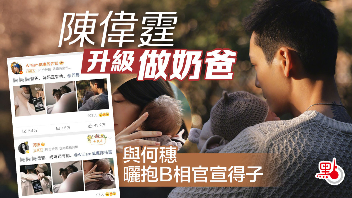 【點新聞報道】陳偉霆升級做奶爸!今日(18日),陳偉霆與內地超模何穗曬出超音波(B超)照、孕期照、和兒子的合照官宣得子,配文「爸爸、媽媽還有他」。其中一張相片,陳偉霆戴「DAD」帽子抱娃,何穗戴「MOM」帽子依偎一旁,向鏡頭展示超音波照。