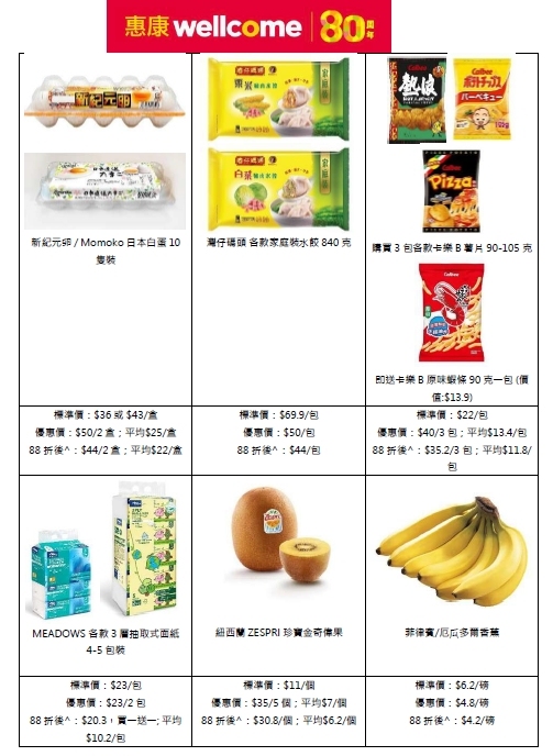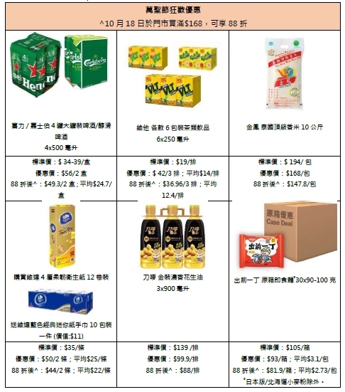 惠康更貼心地推出「萬聖節狂歡優惠」,涵蓋多款精選商品,包括茶類飲品、啤酒、薯片、水果、香米、衞生紙等,無論是籌備狂歡派對還是日常補貨,消費滿指定金額,即享全單88折: