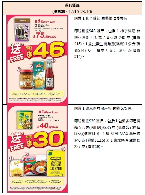 再加推一系列激抵優惠,由10月17日至23日購買,購買1套李錦記舊裝蠔油優惠裝,即送總值$46的豐富禮品;購買1罐家樂牌雞粉珍寶裝575克,即送總值$30的豐富禮品;購買3排可口可樂/玉泉/芬達/雪碧迷你6罐裝汽水,即送總值$34的豐富禮品,齊來以最優惠價錢入手心水產品!