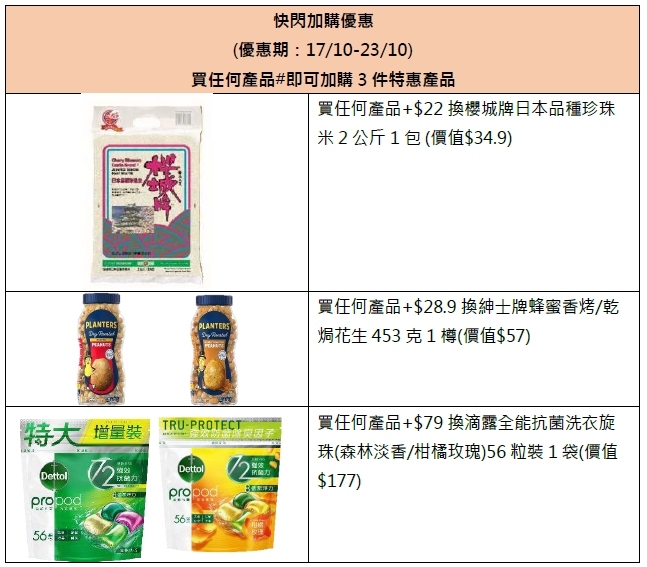優惠驚喜豈止於此?想慳得更多,必睇今期產品加購優惠!顧客凡於惠康門市購買任何產品,在10月17日至23日期間,可以$22加購1包櫻城牌日本品種珍珠米2公斤、以$28.9加購1樽紳士牌蜂蜜香烤/乾焗花生453克,以及$79加購1袋滴露全能抗菌洗衣旋珠56粒裝,優惠繼續密密享,惠康一站式提供生活所需,同大家一齊買得多慳得多!