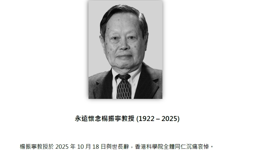 香港科學院今日(18日)發文表示,香港科學院全體同仁沉痛哀悼。發言人指出,楊振寧教授自2015年香港科學院成立之初即為榮譽院士,在粒子物理學領域的開創性研究對現代物理發展影響深遠,更於1957年榮獲諾貝爾物理學獎,成就卓著。
