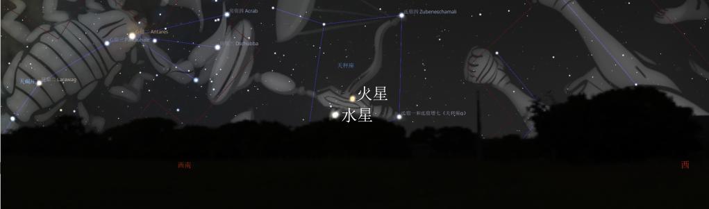10月21日日落後在西南方低空,大約距離地平線5度左右的位置有機會看到兩顆星一明一暗「同框」的畫面,水星視星等為-0.2等,火星為1.5等。王科超說,當天有大約半小時的觀測窗口期,我國南方相較北方觀測條件更好些。