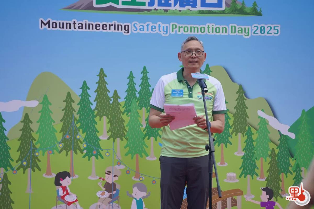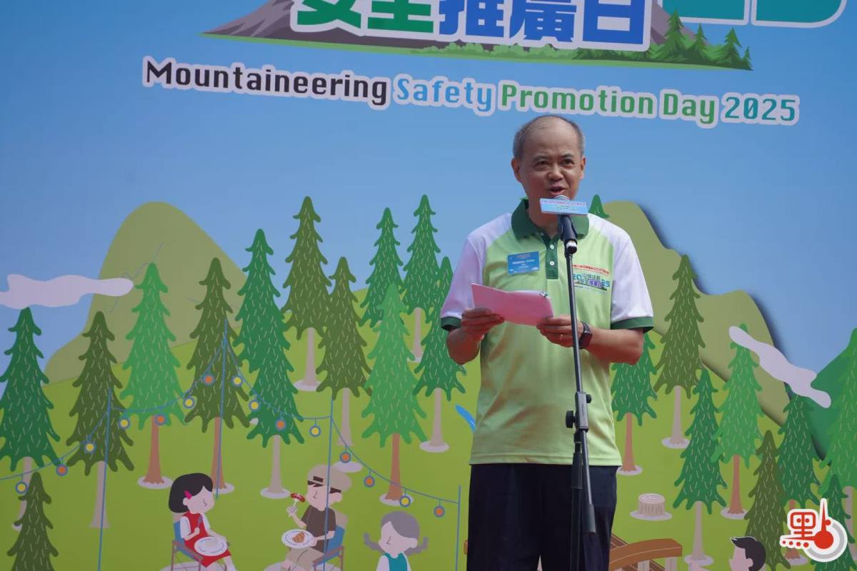 民安隊總參事梁冠康發言時表示,颱風前後,民安隊與天文台合作,進行超前準備,清理山頂排水道等工作。民安隊亦與漁護署等其他部門進行極端天氣後的山嶺勘察和保育工作,為保護自然環境作出貢獻。他提到,民安隊推出遠足錦囊的QR碼,可令遠足時更安心。他呼籲大家向親友推廣山嶺活動安全的重要性,注意行山安全,有備無患,量力而為。