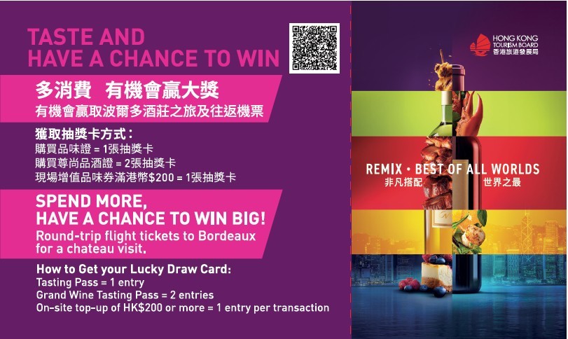 凡購買品味證或於現場增值品味券滿200元,即可獲1張抽獎卡;購買尊尚品酒證,則可獲得2張抽獎卡,買得越多,抽獎機會越多。有機會贏取波爾多酒莊之旅住宿連來回機票,共4位名額,每份獎品價值5萬元。