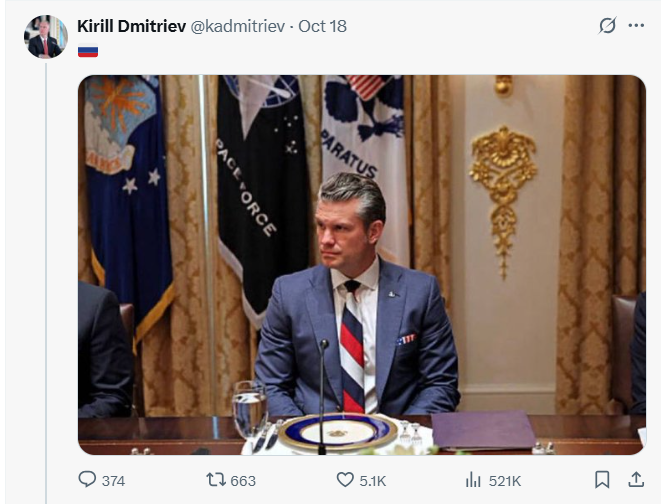 美國YouTuber、時事評論員傑克·布羅(Jake Broe)在社交平台X上發布了一張會議期間拍攝的赫格塞思的照片,並配文:「赫格塞思今日在白宮出席與澤連斯基總統的會晤時,佩戴了一條俄羅斯三色旗領帶。這些人熱愛普京和俄羅斯。」其後,普京的特別代表德米特里耶夫也在社交平台上發布了赫格塞思的照片,並配上了俄羅斯國旗的表情符號。