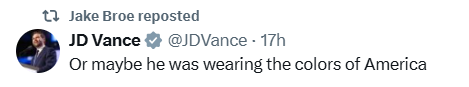 最終,美國副總統萬斯落場支持赫格塞思,他在布羅的帖文下回應稱:「或許他戴的是美國(國旗)的顏色。」