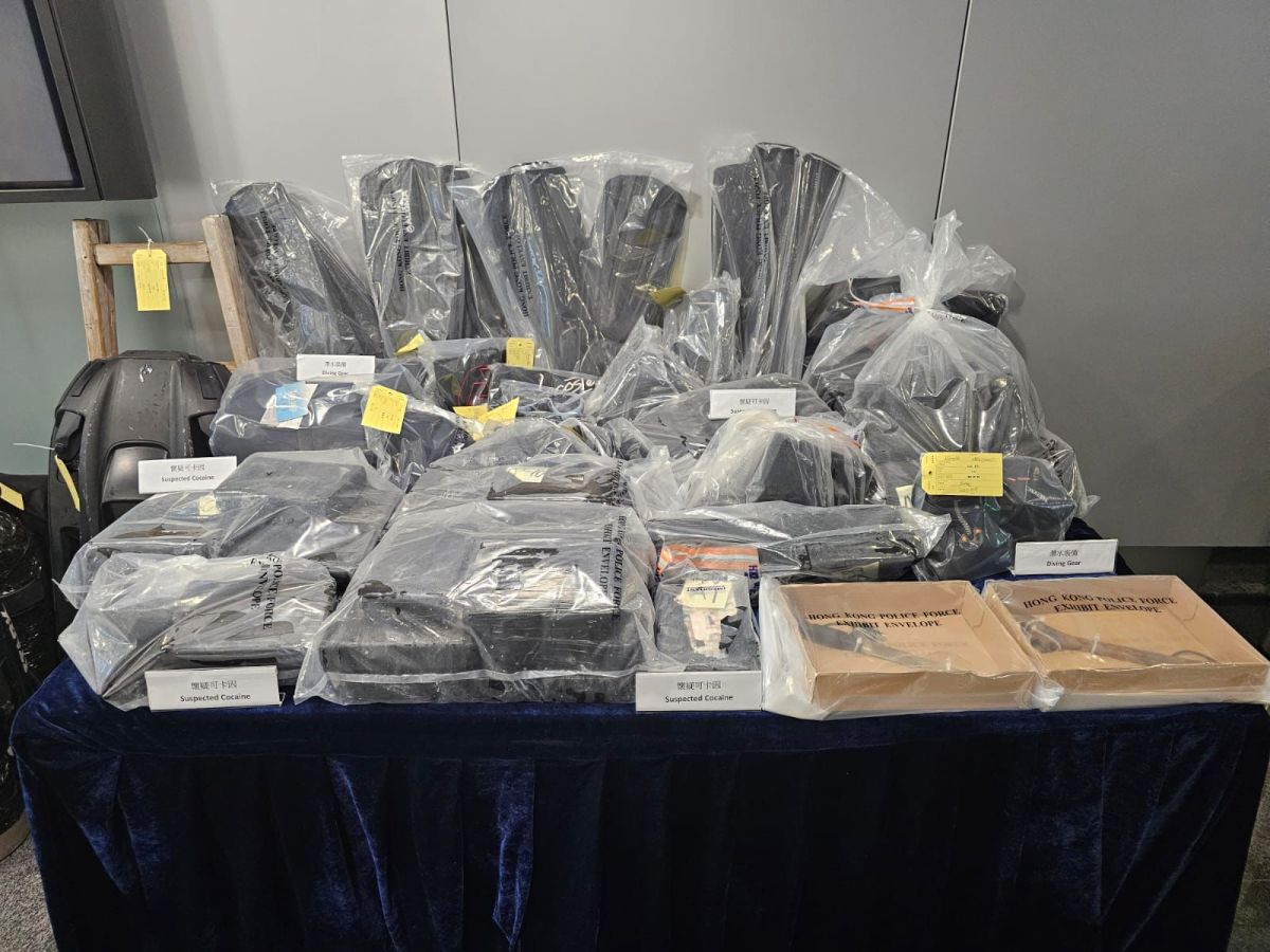 警方探員隨即採取行動,成功截停該私家車,並當場拘捕3名男子。在拘捕過程中,3名男子曾試圖反抗,但均被探員迅速制服。警方在涉案私家車尾箱內發現三大袋物品,共裝有69磚、每磚重1公斤的懷疑可卡因,市值超過4,200萬元。此外,警方在現場及岸邊檢獲一批潛水裝備,包括氧氣瓶、潛水衣、蛙鞋及水底推進器等。警方相信這些裝備是用於販毒集團安排潛水員打撈毒品之用。