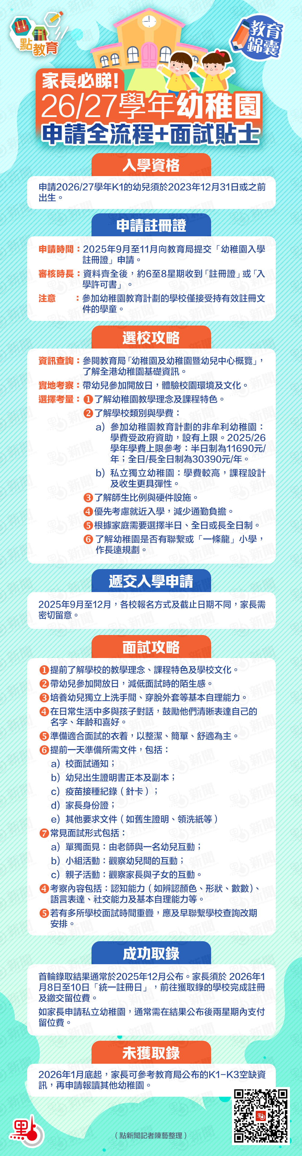 【點新聞報道】幼稚園是幼兒教育旅程的起點,對成長發展至關重要。針對即將在26/27學年入讀幼稚園的幼兒,點教育整理K1入學的關鍵日期、選校要點及面試貼士,逐步解構完整申請流程,助家長高效準備。