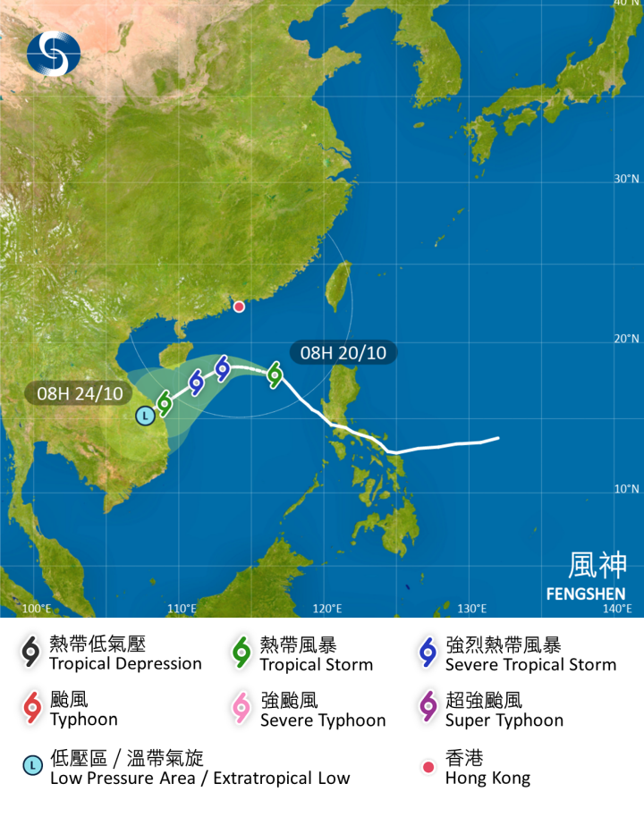 沈志泰指,熱帶氣旋「風神」目前正位處南海中北部,增強至熱帶風暴級別,預計今日將繼續往西北偏西方向移動;同時一股東北季候風正影響廣東沿岸,本港今日大部分時間將吹較強的北風,華南沿岸地區的等壓線及氣壓梯度緊密。他表示,雖然東北季候風會削弱「風神」的強度,但估計兩者將產生共同效應,華南沿岸風勢持續頗大,因此天文台考慮在今日下午5時至7時之間直接改發3號風球。