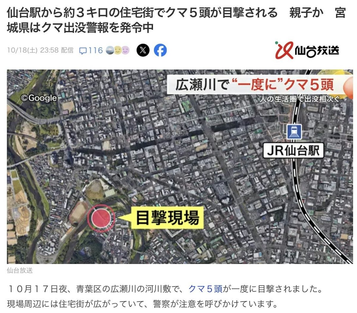 警方到場搜索後未有任何發現,而現場附近住宅林立,並與市內主要車站仙台站不足3公里直線距離。宮城縣政府因為當地民眾生活圈內傳出熊隻出沒個案,因此發出警報,提醒民眾注意。