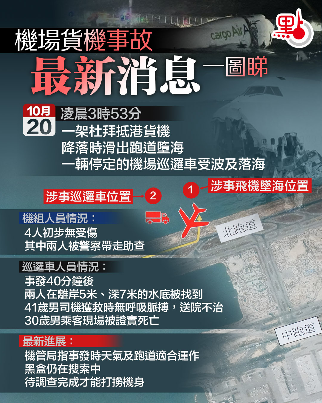 今早凌晨3時53分,一架杜拜來港貨機,在降落機場北跑道時滑出跑道,繼而撞破鐵絲網並墮入海中,事發時,有一輛機場保安有限公司巡邏車被該飛機撞落海中。事發後,機管局即時啟動機場應變中心,消防人員迅速趕抵現場,將機上4名機組人員救出。其後消防人員在水底找到被撞落海的巡邏車,救出兩名機場保安有限公司員工,涉事員工分別在現場及醫院離世。