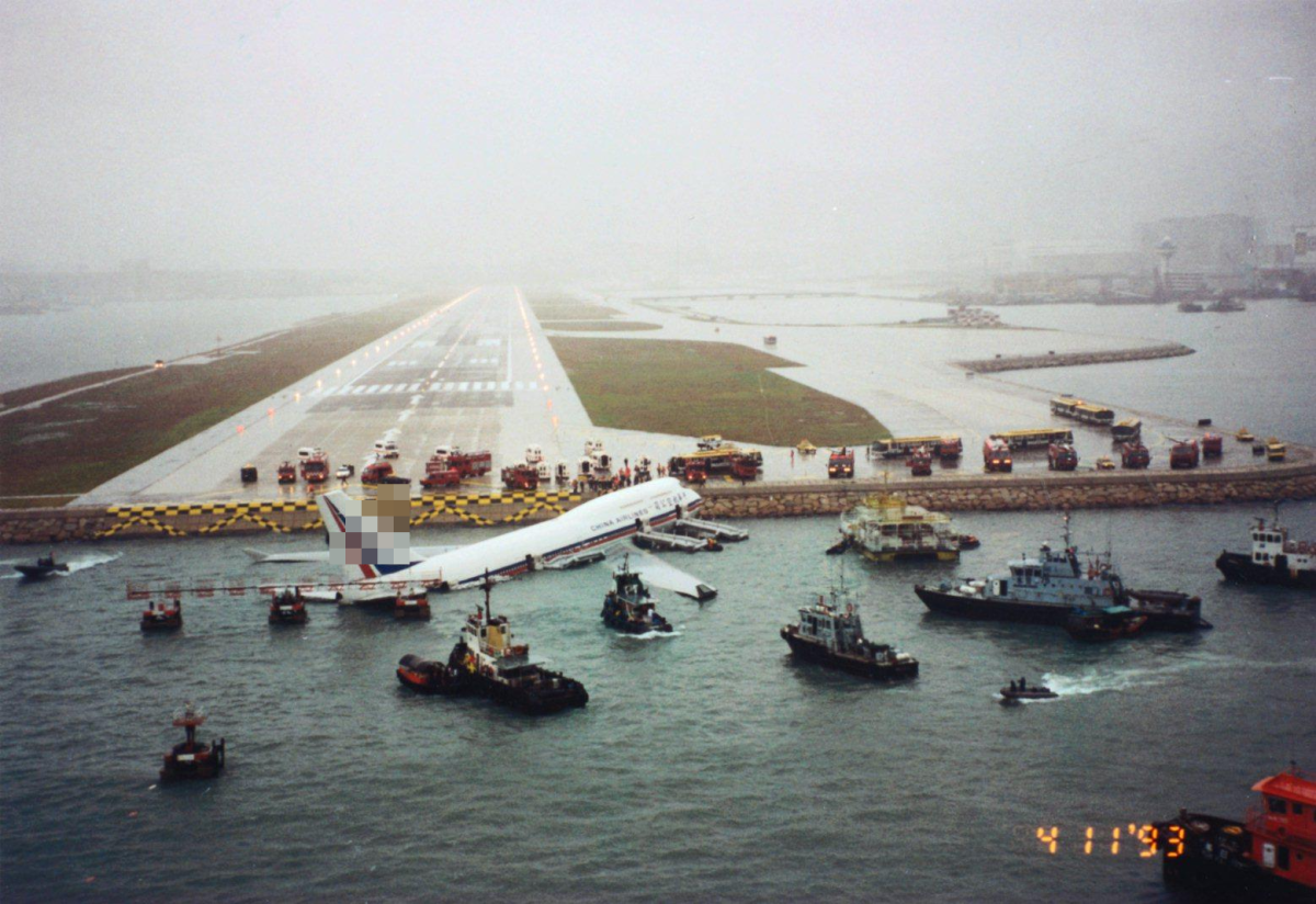 翻查資料,中華航空也曾發生過在香港衝出跑道墜海的事故,造成機上23人受傷。1993年11月4日,香港正受颱風「艾拉」吹襲,天文台正懸掛三號強風信號。華航605號班機搭載了274名乘客、22名機組員,從桃園飛往香港舊機場(啟德機場)。據一些未受傷的乘客表示,飛機着陸後未即時減速,反而繼續加速滑行,直至臨衝入海前數百米才開始急減速,結果衝出跑道並墜入跑道盡頭的海中。幸是次事故中,機上296人全部獲救,其中23人輕傷送醫院,均無大礙。當時的機型是波音747型客機。