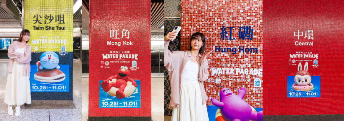 港鐵站牆柱上的站名一向是市民及旅客的人氣打卡熱點,為配合「維港海上大巡遊」,港鐵特別安排四大角色以活動主題造型亮相,包括抱着豆沙包的多啦A夢、躺在水泡上的滑嘟嘟及KAWS & 芝麻街(Elmo),以及躺在冬甩水泡上的LABUBU,分別出現於中環站、銅鑼灣站、尖沙咀站、旺角站及紅磡站的牆柱,注入歡樂與活力,讓乘客盡情打卡合照,為今次盛事留下美好回憶。而內地訪港旅客所途經的落馬洲站到境大堂,亦將以4位人氣角色造型主題作裝飾,熱烈歡迎各位旅客乘搭東鐵綫直達金鐘,參與是次全城盛事。