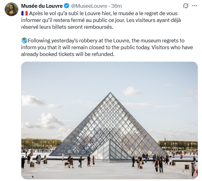 【點新聞報道】經歷10月19日劫案後,當地時間10月20日星期一,法國羅浮宮博物館宣布關閉,是連續第二天閉館。已訂票的參觀人士可退票。