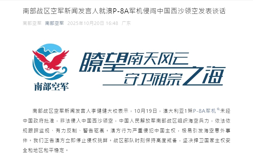 【點新聞報道】據「南部空軍」微信公眾號消息,南部戰區空軍新聞發言人李健健大校表示,10月19日,澳大利亞1架P-8A軍機未經中國政府批准,非法侵入中國西沙領空,中國人民解放軍南部戰區組織海空兵力,依法依規跟蹤監視、有力反制、警告驅離。