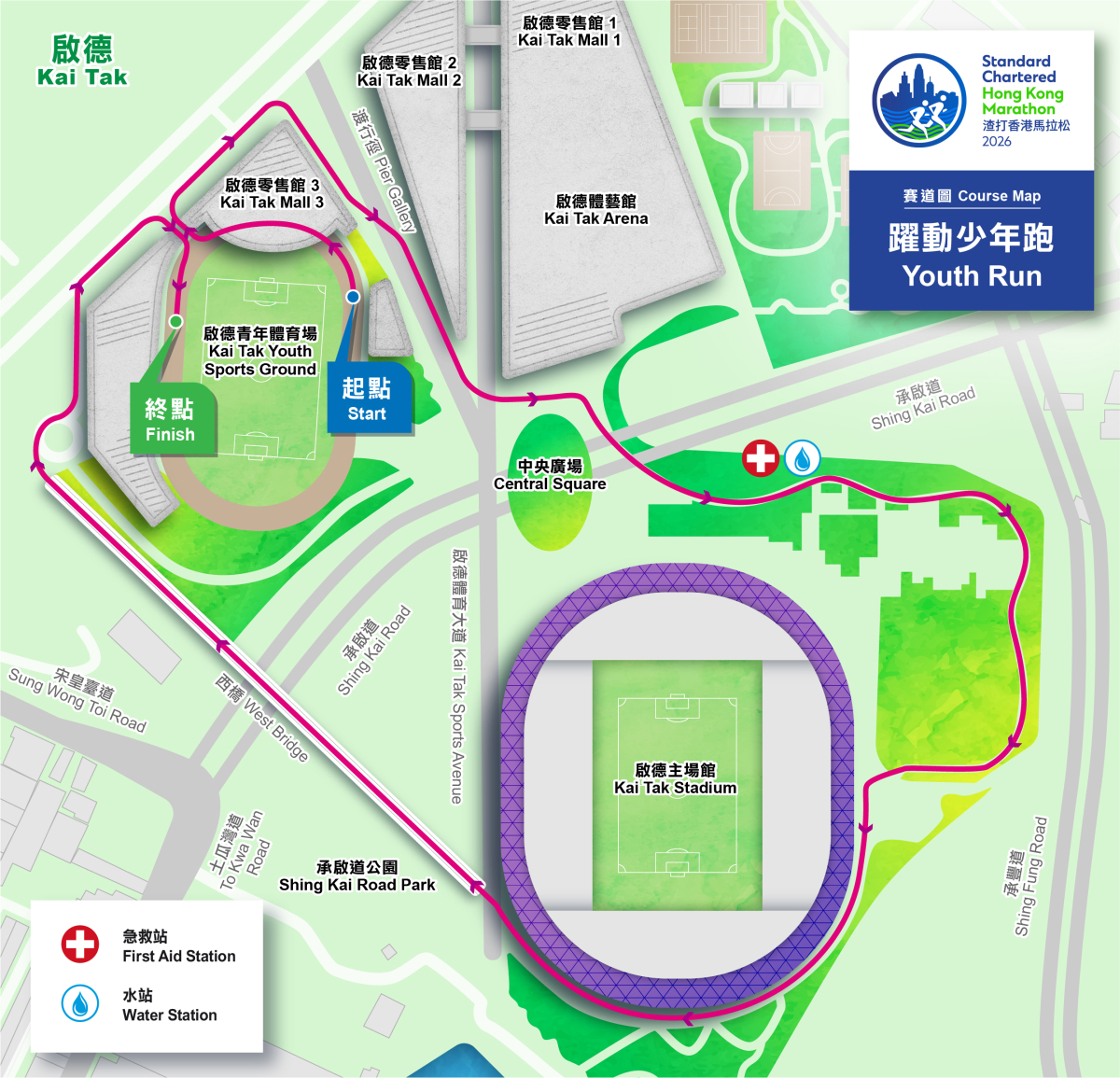 - 起點/終點:由啟德體育園內的啟德青年運動場出發,途經啟德主場館,以返回啟德青年運動場為終點