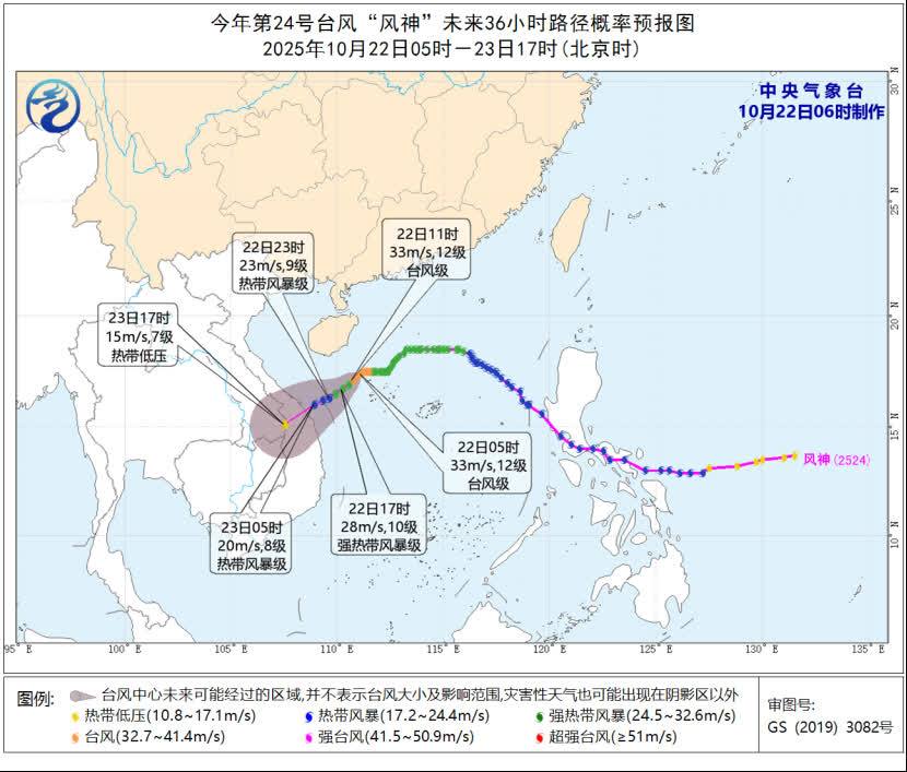 預計,「風神」將以每小時10-15公里的速度向西南方向移動,今天早晨至上午強度先維持,之後強度逐漸減弱,並將於23日白天以熱帶風暴級(18-23米/秒,8-9級)在越南中部沿海登陸,登陸後強度快速減弱。