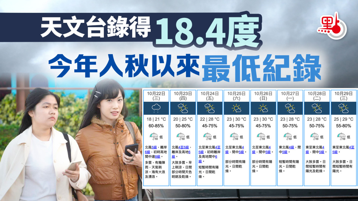 【點新聞報道】天文台今日(22日)表示,受強烈東北季候風影響,本港今早稍涼。截至早上8時40分,天文台錄得最低氣溫18.4度,是今年入秋以來的最低紀錄。此外,強烈熱帶風暴「風神」的外圍雨帶正為廣東沿岸及南海北部帶來幾陣雨。