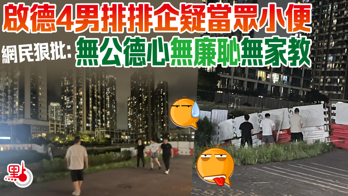 【點新聞報道】當眾小便是非常缺德的行為!近日網上瘋傳一段影片,4名男子在啟德一個屋苑對開的圍板前,一同拉下褲鏈,疑似當眾小便。不少網民狠批「無公德心、無廉恥、無家教」,更有人指原來附近100米已有廁所。