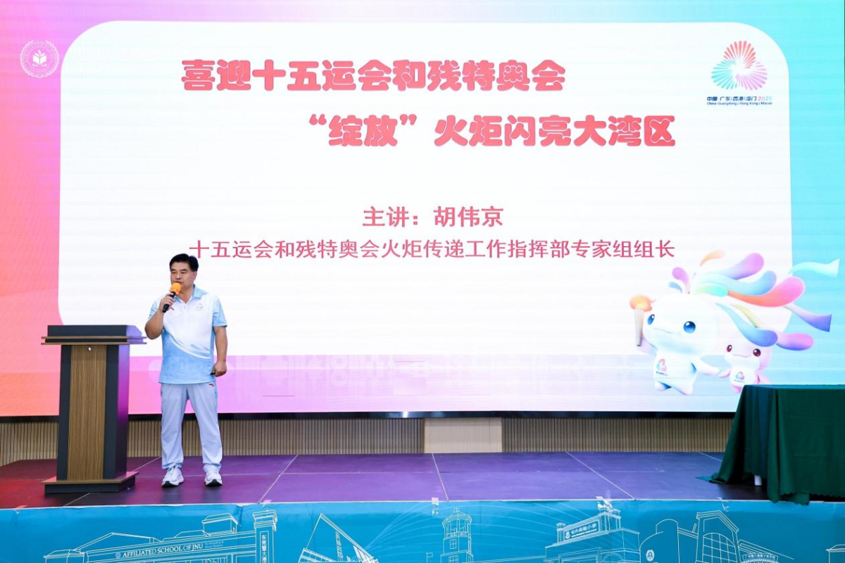 【點新聞報道】十五運會和殘特奧會進入開幕倒計時,十五運火炬傳遞活動亦走進廣州的校園。昨日(21日),廣州暨大港澳子弟學校舉行「薪火相傳 強國有我」全運火炬進校園活動。十五運會暨殘特奧會火炬傳遞工作指揮部專家組組長胡偉京表示,火炬名為「綻放」,頂部以粵港澳三地禮花為型,體現三地聯合辦賽;底部飾以牡丹,象徵國家支持下大灣區的繁榮發展。「這次火炬傳遞不僅是體育精神的象徵,更是激勵大灣區青少年樹立家國認同與責任擔當的重要載體。」