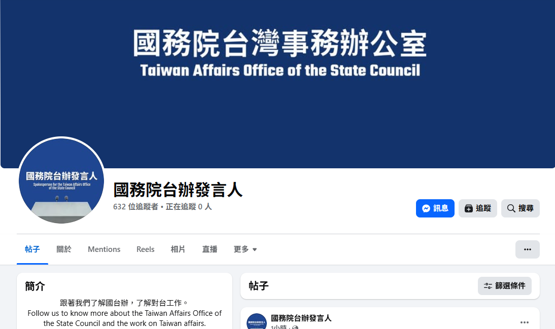 據了解,「國務院台辦發言人」FB賬號以繁體中文發布內容,賬號簡介以中英文寫到「跟着我們了解國台辦,了解對台工作」。
