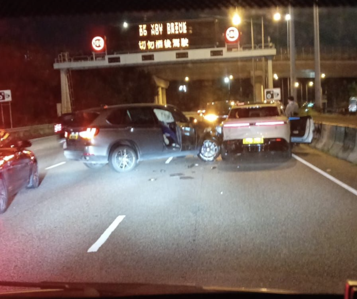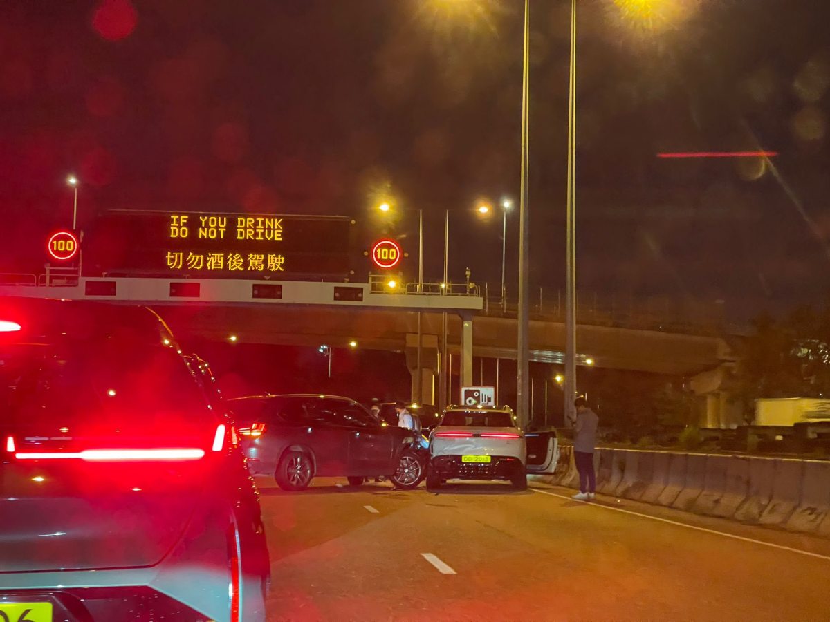 【點新聞報道】今晚(22日)8時53分左右,吐露港公路近香港科學園路段發生交通意外。從網絡圖片可見,一輛SUV轎車與一輛白色私家車相撞,SUV轎車橫亘在車道分界線上,擋住行車線,司機正下車交涉,暫時未報有人受傷。