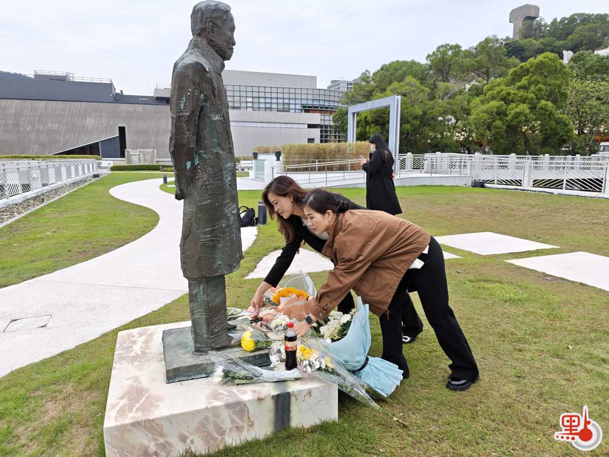 在弔唁室不遠處的邵逸夫夫人樓天台花園草坪上,屹立着中大於2007年為楊振寧榮獲諾貝爾獎50周年暨85歲生日而揭幕的銅像,雕像腳下簇擁着鮮花。浙江工業大學的曹飛鳳老師今年以訪問學者身份來到香港中文大學學習。她和她的朋友在得知弔唁室開放後,便從家邊街市購買鮮花,特地帶到雕像前獻上。她指自己也有國外留學經驗,對楊振寧教授在當時國內條件並不算優渥的情況下,毅然決然回國的精神感到感動,表示這是每一個在國外研究的學子的心愿,值得所有人學習。