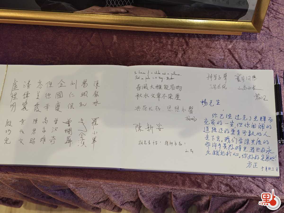 曾在中大物理系執教超30年、現已85歲的榮譽院士陳方正回憶,他和楊振寧已是相識近40年的老朋友,指楊振寧的研究在基本物理學理論的進步上起到了決定性的作用。他引用孟子的「充實而有光輝之謂大」形容楊振寧教授的一生,讚他是「一個真正的偉人」。在遺照前,他留言寫道,「楊先生,你已經過完了光輝而充實的一生,但你開闢的道路還要有無數的人走下去。我們曾經共度的那許多美好時光,我也將永久銘記於心,你好好安息吧。」
