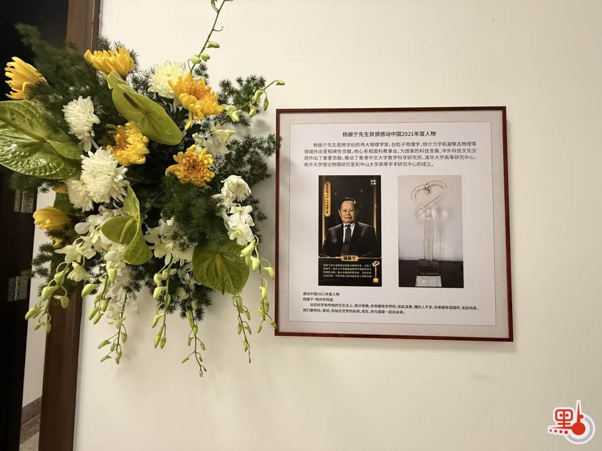 記者來到清華大學高等研究院,院外等候弔唁的人群排成長隊,在寒風中靜默等候。緬懷室內,楊振寧先生的遺像被鮮花環繞。弔唁人員簽到後有序進入119室後敬獻鮮花,並向楊振寧先生遺像三鞠躬。離開緬懷室,記者在現場領取了一本《楊振寧先生生平》的紀念手冊。手冊寫道:「楊振寧以身垂範,以八十多歲高齡繼續從事一線教學科研工作,親自參與物理學人才培養工作,為清華大一學生講授『普通物理』課程,為推動清華大學冷原子物理、凝聚態物理、密碼學等基礎學科的發展和學校人才培養事業傾注了大量心血、作出了極大貢獻,對中國高等教育的改革發展產生了重要影響。」