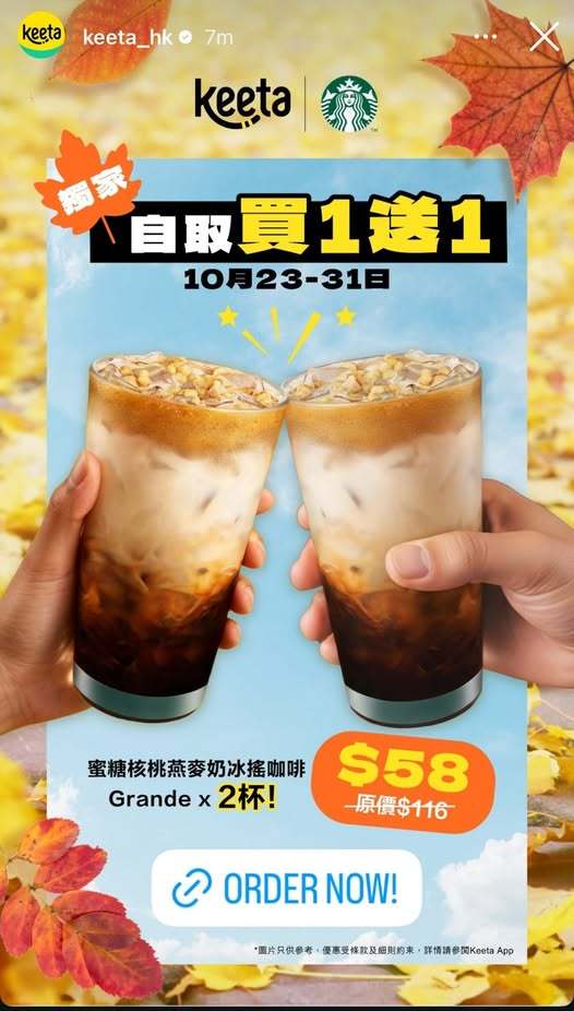 【點新聞報道】Keeta APP推出限時獨家Starbucks優惠,今日(23日)起至10月31日,蜜糖核桃燕麥奶冰搖咖啡外賣自取買一送一,$58可以買到兩杯,約埋朋友一齊飲!