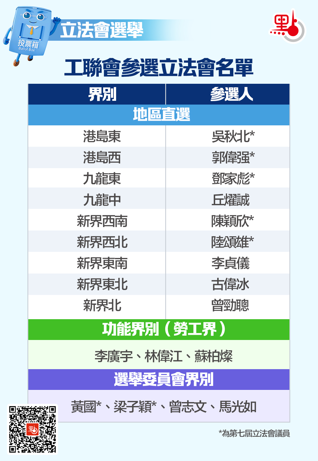 功能界別方面,勞顧會成員林偉江、香港IT人協會會長李廣宇,以及工聯會副理事長蘇栢燦3人出戰勞工界。選委會界別方面,工聯會共有4人出戰,包括現任選委界議員、工聯會理事長黃國爭取連任,現任勞工界議員梁子穎「轉跑道」,在選委會界別爭取連任;工聯會副會長馬光如、曾志文一同出戰選委會界別。