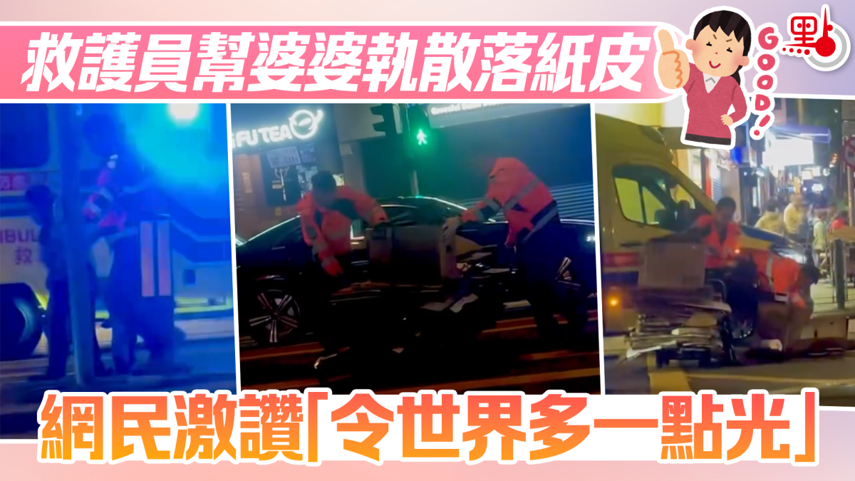 樓主表示,推着滿車紙皮的婆婆過馬路時,車上的紙皮不慎散落,佔據了路面。此時,一輛救護車恰好經過,車上的救護員見狀,便立即停車並下車協助。從影片中可見,兩三名救護員迅速將散落一地的紙皮撿起,其中一位隊員更是貼心地護送婆婆回到行人路上。樓主續指,救護人員在離開前還不忘叮囑婆婆,「下次唔好推(堆)得咁多咁高,唔安全㗎」。