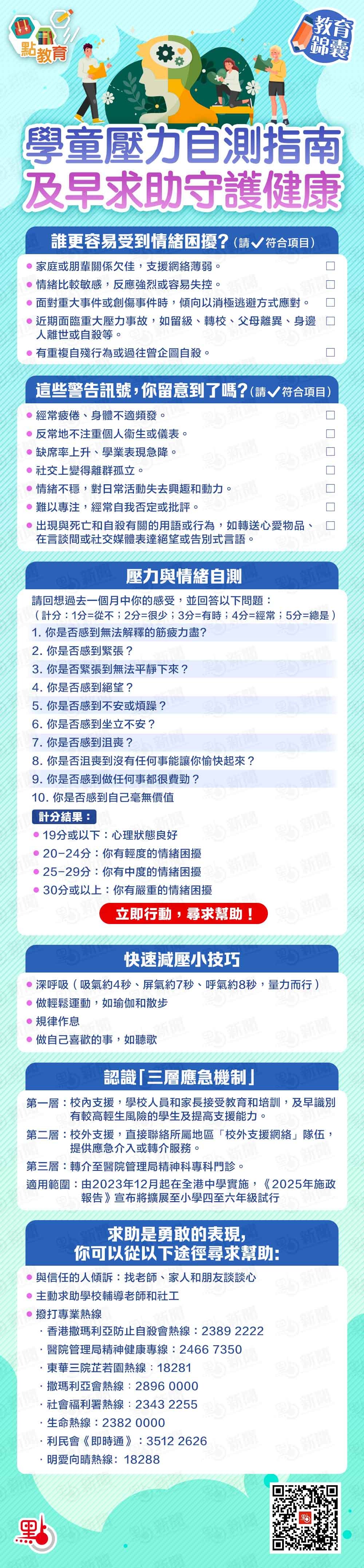 【點新聞報道】根據教育局數據,2020年至2024年共有130多名學童輕生,情況令人憂心。生活和學業上的壓力與情緒困擾,有時就像無聲的浪潮,在不知不覺間累積,將人吞沒。快來完成以下測試,了解自己或身邊人的心理健康狀況,並學習如何及時求助!