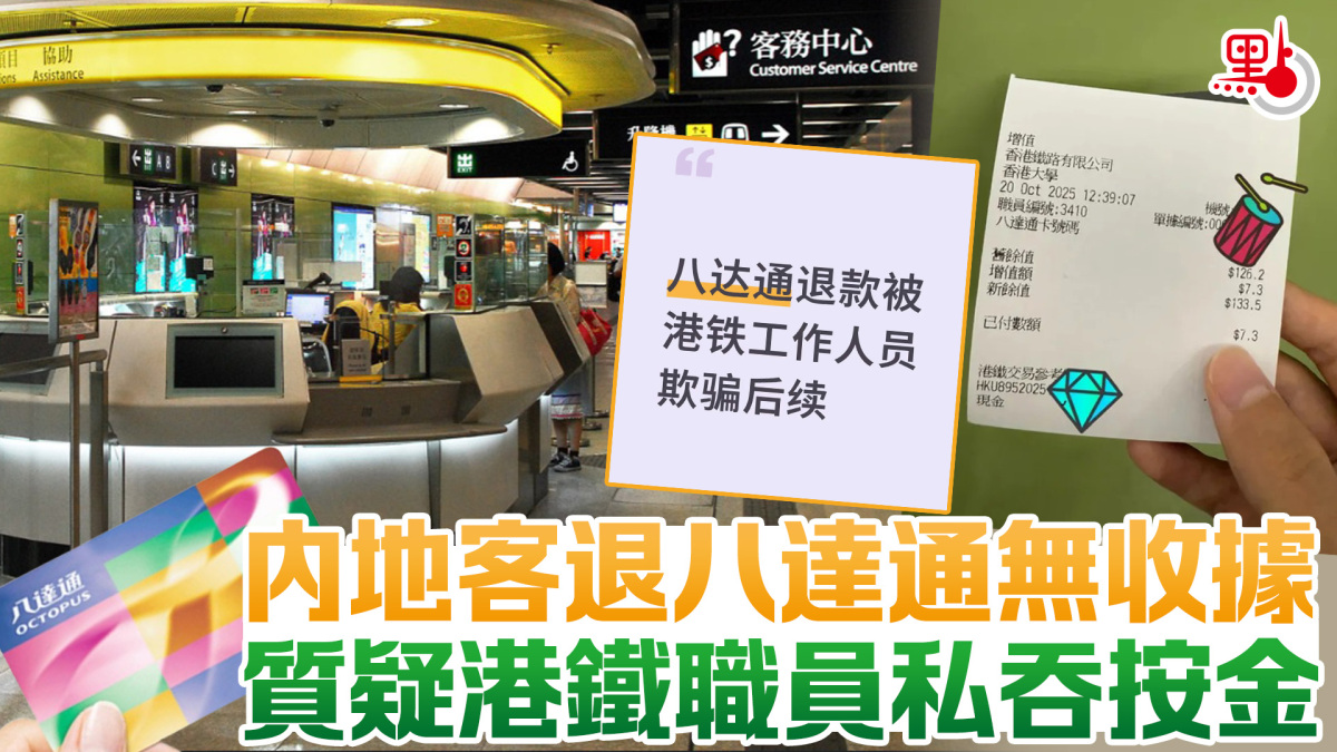 【點新聞報道】一名內地遊客在社交平台小紅書發帖,指早前在港鐵站辦理八達通退款時,疑遭職員私吞欺騙,未有退還按金及提供收據。事主向八達通公司投訴,竟發現該卡根本未被正式退還。港鐵回覆查詢時表示,接獲乘客查詢後已立即跟進,退還全數餘額及按金,並隨即展開調查及跟進,並將相關人員調離客務中心職務。
