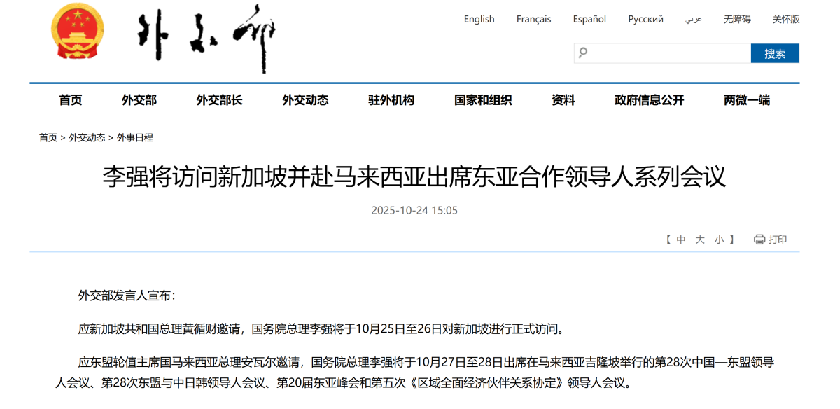 應東盟輪值主席國馬來西亞總理安瓦爾邀請,國務院總理李強將於10月27日至28日出席在馬來西亞吉隆坡舉行的第28次中國—東盟領導人會議、第28次東盟與中日韓領導人會議、第20屆東亞峰會和第五次《區域全面經濟夥伴關係協定》領導人會議。
