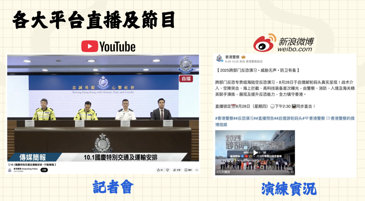 警隊除新平台開拓外,亦透過新技術應用,令直播能力全面升級。自2019年建立直播系統以來,已將直播範圍拓至Facebook、YouTube、微信及抖音,實現多平台同步直播,確保資訊全面覆蓋。警方表示,早前跨部門反恐演習直播,是警方首次實現全平台同步觀看,觀看人數達117萬,其中抖音平台貢獻了近六成的觀看量。